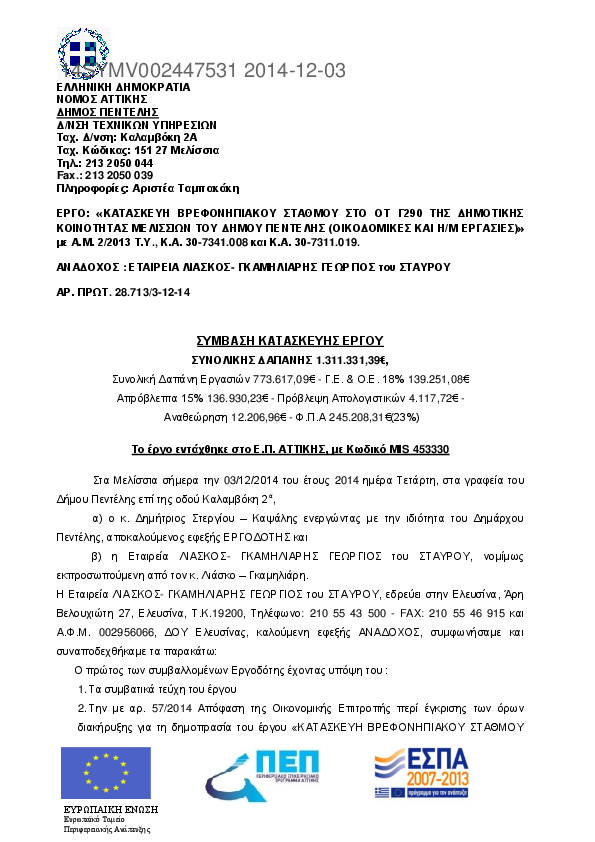2. ΣΥΜΒΑΣΗ ΓΙΑ ΤΗΝ ΚΑΤΑΣΚΕΥΗ ΤΟΥ ΕΡΓΟΥ: ΚΑΤΑΣΚΕΥΗ ΒΡΕΦΟΝΗΠΙΑΚΟΥ ΣΤΑΘΜΟΥ ΣΤΟ ΟΤ Γ290 ΤΗΣ Δ.Κ. ΜΕΛΙΣΣΙΩΝ