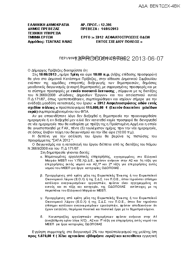 2. Κατάρτιση όρων διακήρυξης και τευχών δημοπράτησης εκτέλεσης του έργου «Σ012 ΑΣΦΑΛΤΟΣΤΡΩΣΕΙΣ ΟΔΩΝ ΕΝΤΟΣ ΣΧΕΔΙΟΥ ΠΟΛΗΣ»