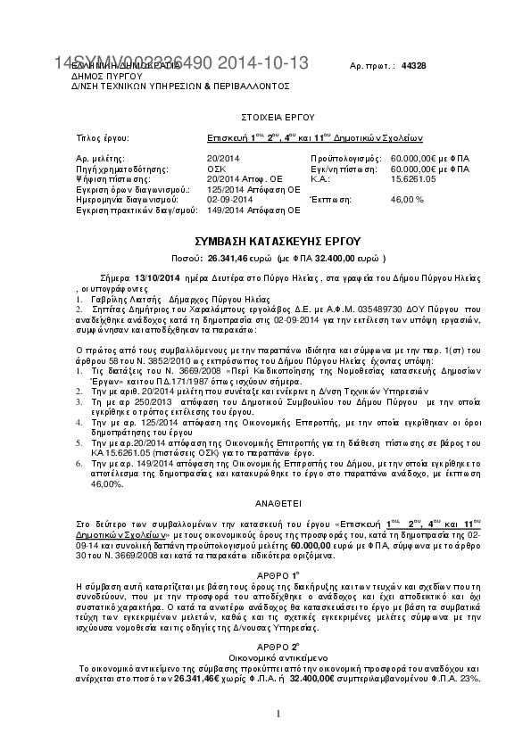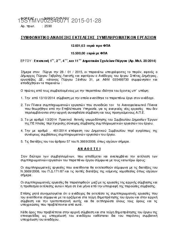 9. Συμπληρωματική Σύμβαση "Επισκευή 1ου, 2 ου, 4 ου, και 11 ου Δημοτικών Σχολείων Πύργου"