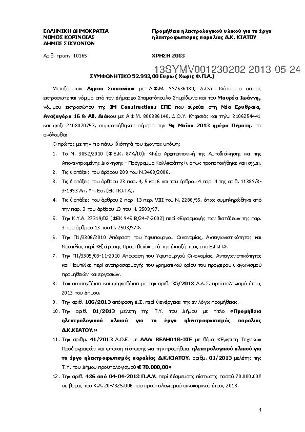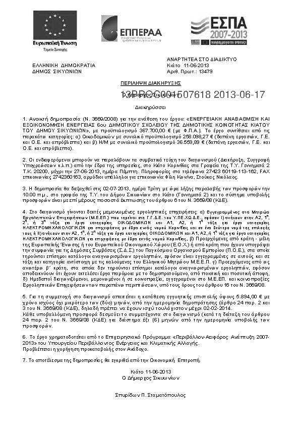 1. ΠΕΡΙΛΗΨΗ ΔΙΑΚΗΡΥΞΗΣ ΓΙΑ ΤΗΝ ΑΝΑΘΕΣΗ ΕΚΤΕΛΕΣΗΣ ΤΟΥ ΕΡΓΟΥ: «ΕΝΕΡΓΕΙΑΚΗ ΑΝΑΒΑΘΜΙΣΗ ΚΑΙ ΕΞΟΙΚΟΝΟΜΗΣΗ ΕΝΕΡΓΕΙΑΣ 6ου ΔΗΜΟΤΙΚΟΥ ΣΧΟΛΕΙΟΥ ΤΗΣ ΔΗΜΟΤΙΚΗΣ ΚΟΙΝΟΤΗΤΑΣ ΚΙΑΤΟΥ ΤΟΥ ΔΗΜΟΥ ΣΙΚΥΩΝΙΩΝ»