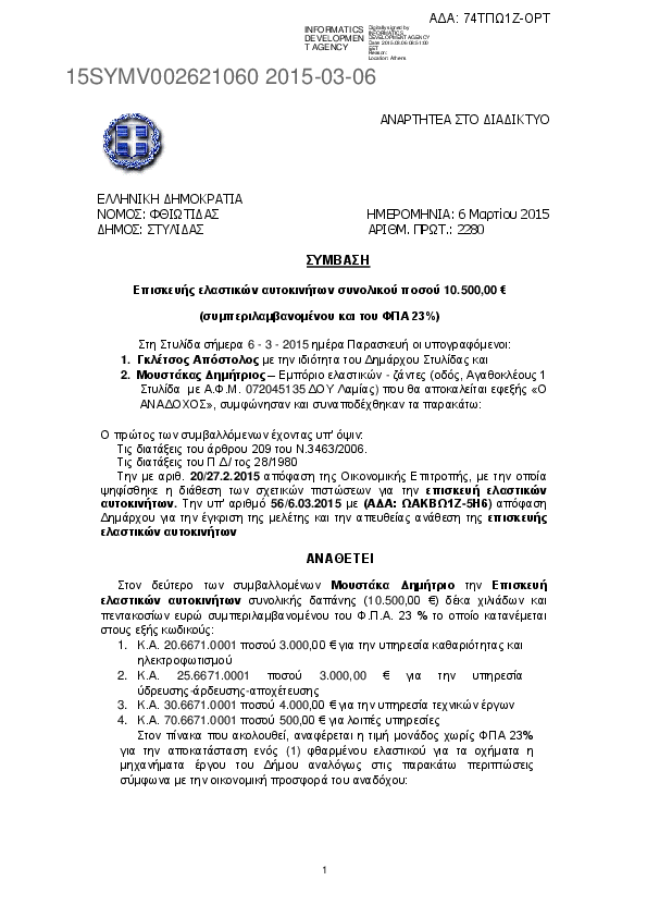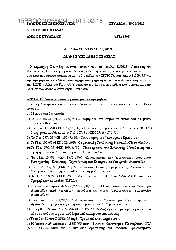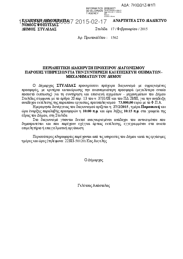 1. ΠΕΡΙΛΗΨΗ ΔΙΑΚΗΡΥΞΗΣ ΠΡΟΧΕΙΡΟΥ ΔΙΑΓΩΝΙΣΜΟΥ ΠΑΡΟΧΗΣ ΥΠΗΡΕΣΙΩΝ ΓΙΑ ΤΗ ΣΥΝΤΗΡΗΣΗ ΚΑΙ ΕΠΙΣΚΕΥΗ ΟΧΗΜΑΤΩΝ - ΜΗΧΑΝΗΜΑΤΩΝ ΤΟΥ ΔΗΜΟΥ