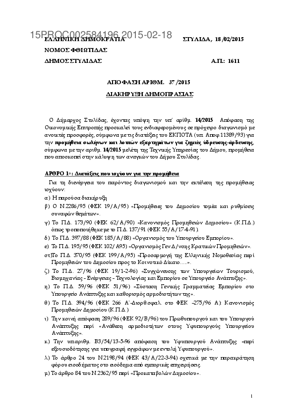 3. ΔΙΑΚΗΡΥΞΗ ΓΙΑ ΤΗΝ ΠΡΟΜΗΘΕΙΑ ΣΩΛΗΝΩΝ ΚΑΙ ΛΟΙΠΩΝ ΕΞΑΡΤΗΜΑΤΩΝ ΓΙΑ ΖΗΜΙΕΣ ΥΔΡΕΥΣΗΣ-ΑΡΔΕΥΣΗΣ