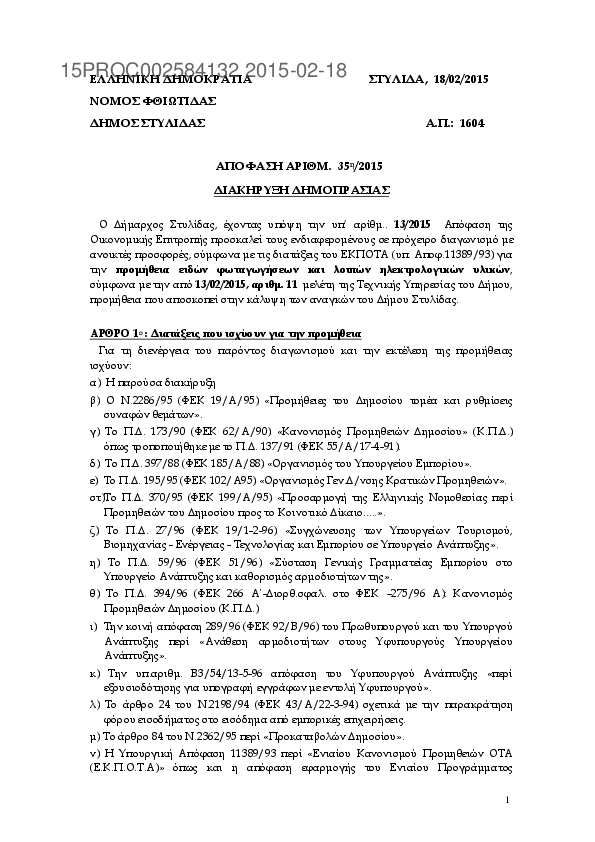 4. ΔΙΑΚΗΡΥΞΗ ΠΡΟΧΕΙΡΟΥ ΔΙΑΓΩΝΙΣΜΟΥ ΓΙΑ ΤΗΝ ΠΡΟΜΗΘΕΙΑ ΕΙΔΩΝ ΦΩΤΑΓΩΓΗΣΕΩΝ ΚΑΙ ΛΟΙΠΩΝ ΗΛΕΚΤΡΟΛΟΓΙΚΩΝ ΥΛΙΚΩΝ ΔΗΜΟΥ ΣΤΥΛΙΔΑΣ