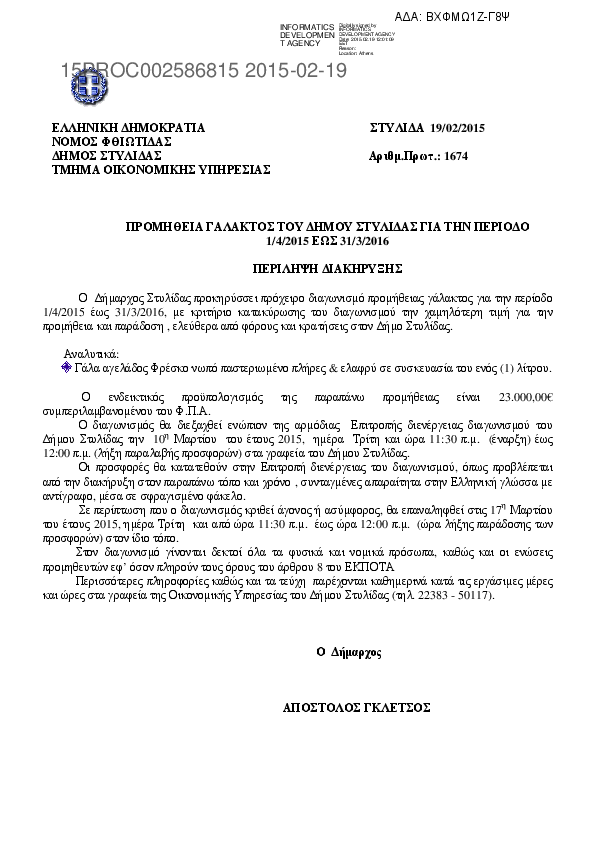 5. ΠΡΟΜΗΘΕΙΑ ΓΑΛΑΚΤΟΣ ΤΟΥ ΔΗΜΟΥ ΣΤΥΛΙΔΑΣ ΓΙΑ ΤΗΝ ΠΕΡΙΟΔΟ1/4/2015 ΕΩΣ 31/3/2016