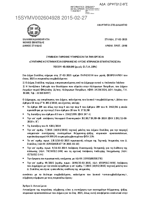 6. ΣΥΜΒΑΣΗ ΠΑΡΟΧΗΣ ΥΠΗΡΕΣΙΩΝ ΓΙΑ ΤΗΝ "ΣΥΝΤΗΡΗΣΗ ΣΥΣΤΗΜΑΤΩΝ ΘΕΡΜΑΝΣΗΣ - ΨΥΞΗΣ ΚΤΙΡΙΑΚΩΝ ΕΓΚΑΤΑΣΤΑΣΕΩΝ"