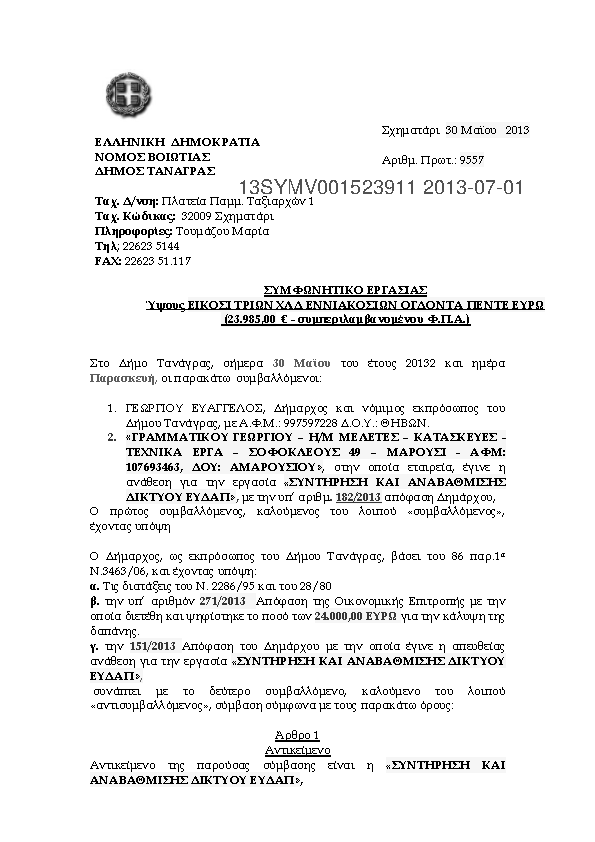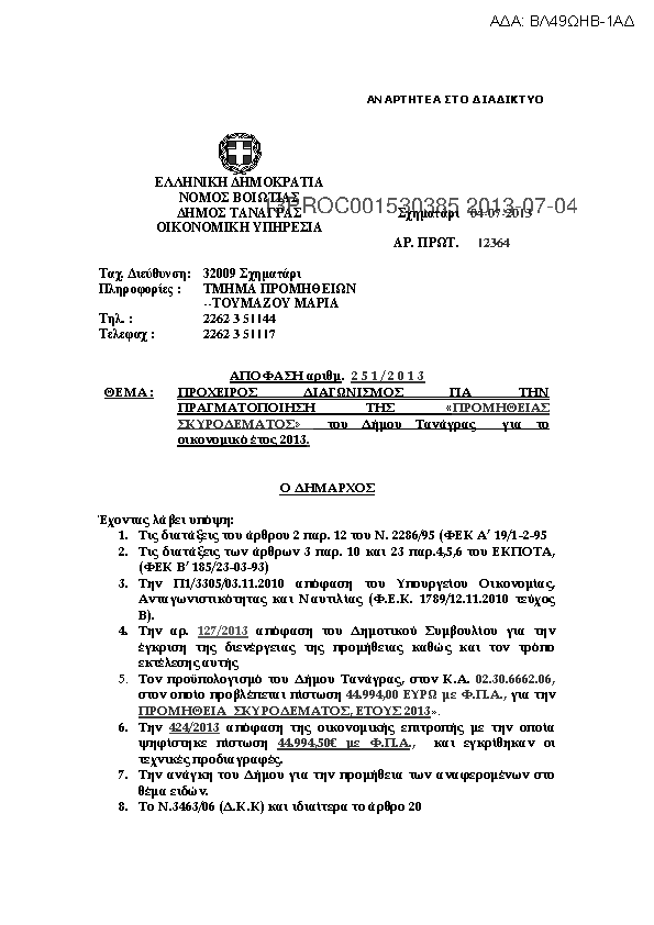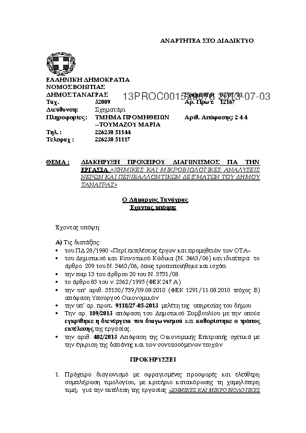 2. ΑΠΟΦΑΣΗ ΔΙΑΚΗΡΥΞΗΣ ΓΙΑ ΤΟΝ ΠΡΟΧΕΙΡΟ ΔΙΑΓΩΝΙΣΜΟ ΠΡΟΜΗΘΕΙΑΣ ΣΚΥΡΟΔΕΜΑΤΟΣ 2013 ΤΟΥ ΔΗΜΟΥ ΤΑΝΑΓΡΑΣ