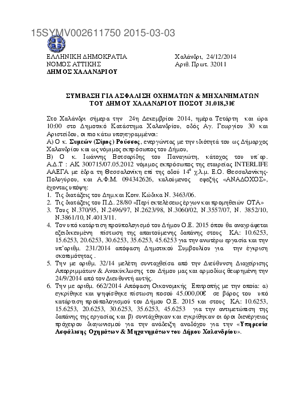 7. ΣΥΜΒΑΣΗ ΓΙΑ ΑΣΦΑΛΙΣΗ ΟΧΗΜΑΤΩΝ & ΜΗΧΑΝΗΜΑΤΩΝ ΤΟΥ ΔΗΜΟΥ ΧΑΛΑΝΔΡΙΟΥ