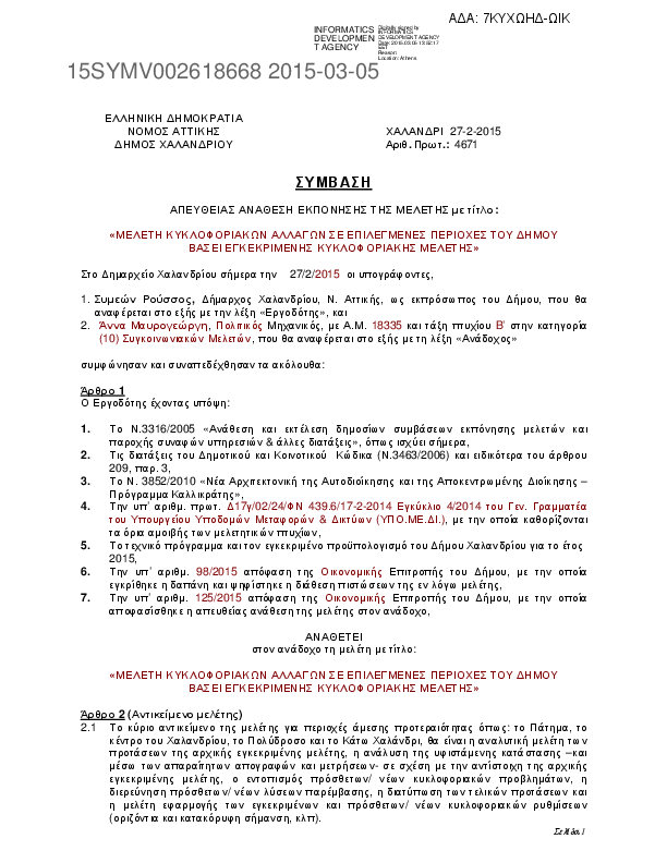 9. Σύμβαση απευθείας ανάθεσης εκπόνησης της μελέτης: Μελέτη κυκλοφοριακών αλλαγών σε επιλεγμένες περιοχ