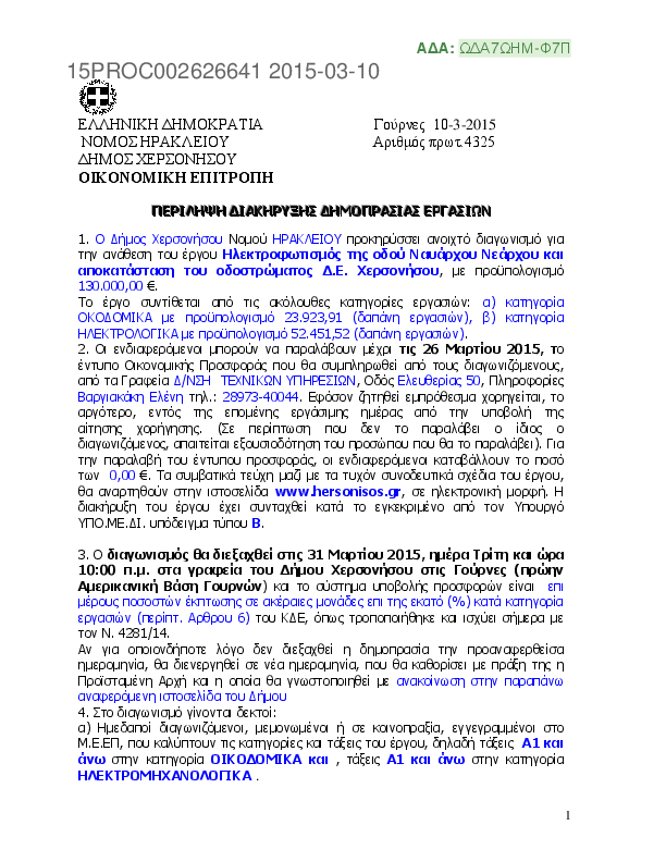 9. Περιληπτική και αναλυτική διακήρυξη για το έργο Ηλεκτροφωτισμός της οδού Ναυάρχου Νεάρχου και αποκατάσταση του οδοστρώματος Δ.Ε. Χερσονήσου