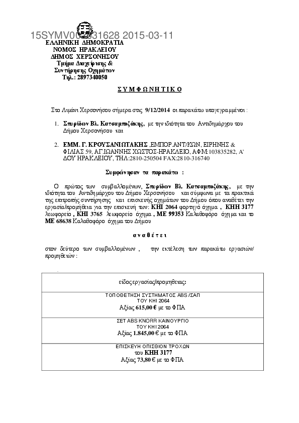 10. Σύμβαση για την επισκευή τωνΚΗΙ 2064 φορτηγό όχημα , ΚΗΗ 3177 λεωφορείο , ΚΗΙ 3765 λεωφορείο όχη