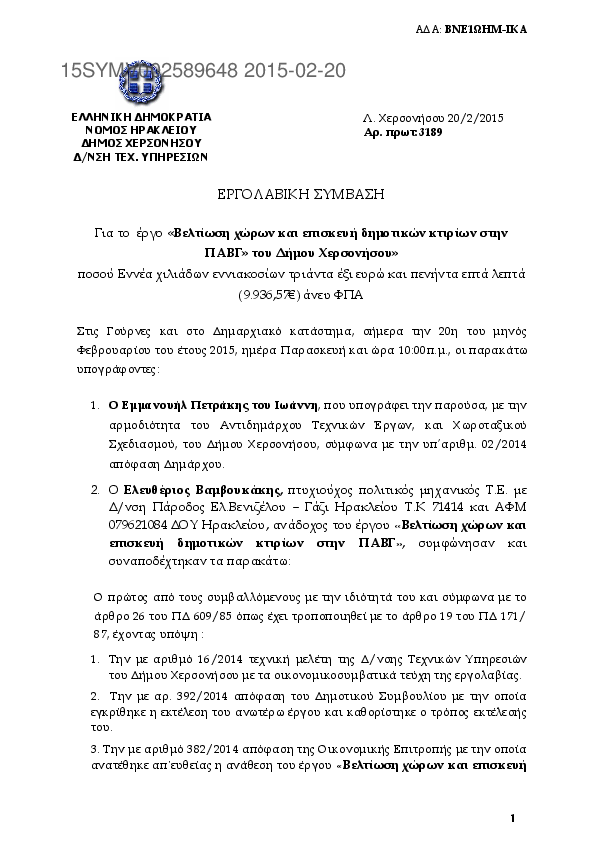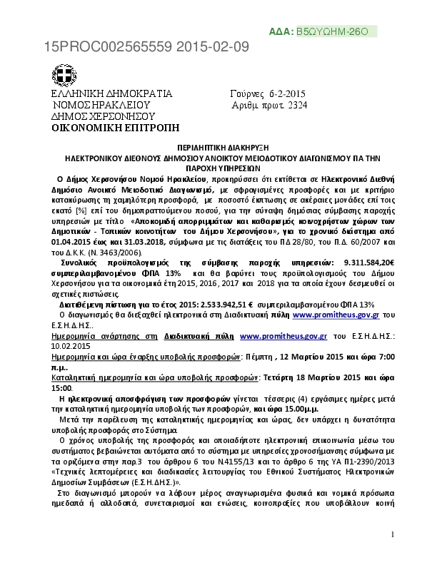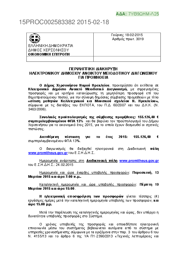 1. Περιληπτική και αναλυτική διακήρυξη για την Αποκομιδή απορριμμάτων και καθαρισμός κοινοχρήστων χώρων των Δημοτικών - Τοπικών κοινοτήτων του Δήμου Χερσονήσου