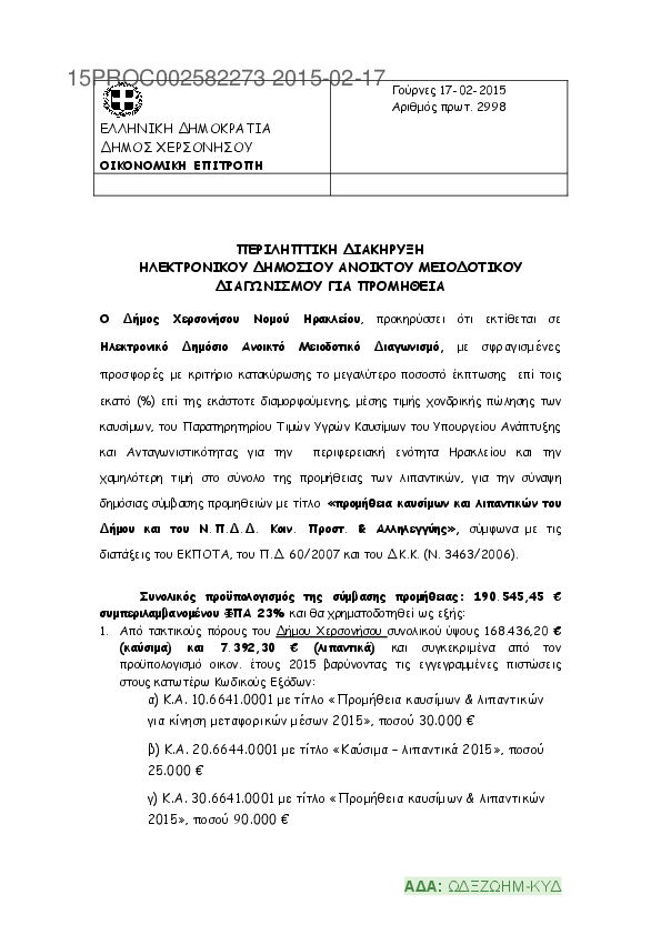 5. Περιληπτική και αναλυτική διακήρυξη για την Προμήθεια Καυσίμων και Λιπαντικών για το Δήμο και το ΝΠΔΔ του Δήμου