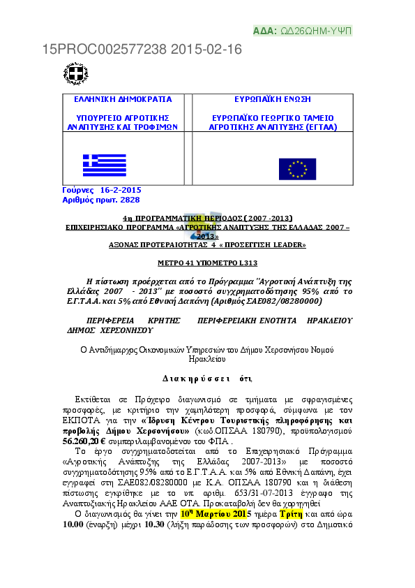 4. Περιληπτική και αναλυτική επαναληπτική διακήρυξη για την προμήθεια για την ίδρυση κέντρου τουριστικής πληροφόρησης και προβολής του Δήμου