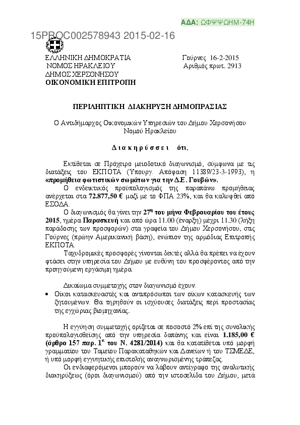 3. Περιληπτική και αναλυτική διακήρυξη για την προμήθεια φωτιστικών σωμάτων για την ΔΕ Γουβών
