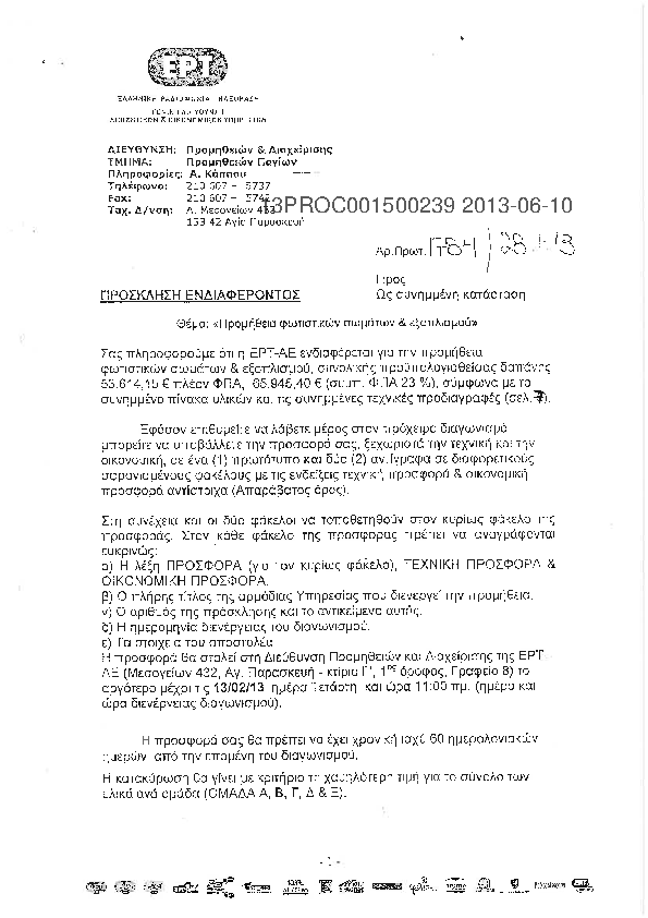 1. ΠΡΟΜΗΘΕΙΑ ΦΩΤΙΣΤΙΚΩΝ ΣΩΜΑΤΩΝ ΔΙΑΦΟΡΩΝ ΤΥΠΩΝ ΓΙΑ ΟΠΤΙΚΟΑΚΟΥΣΤΙΚΕΣ ΛΗΨΕΙΣ / ΦΟΡΕΑΣ ΕΡΤ Α.Ε.
