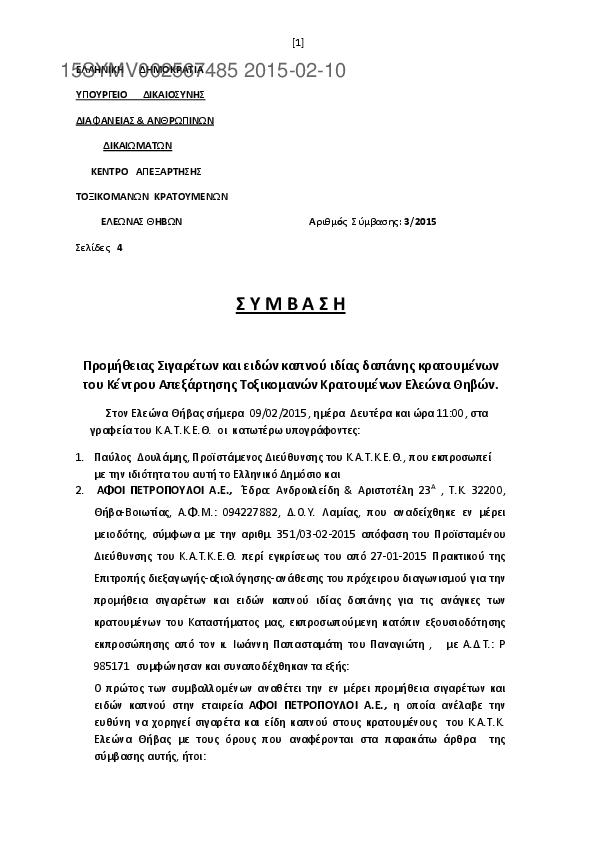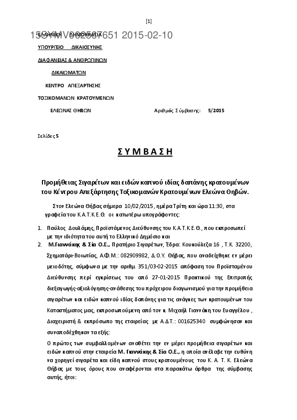 1. Προμήθεια σιγαρέτων ιδίας δαπάνης κρατουμένων ΚΑΤΚ Ελεώνα Θηβών