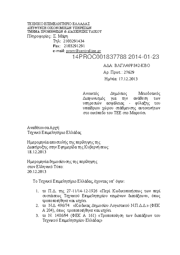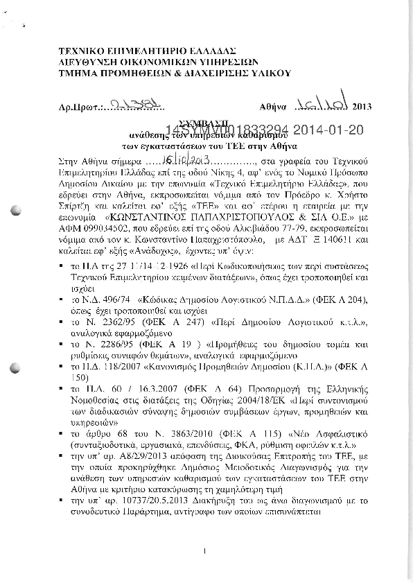 3. Ανάθεση Υπηρεσιών Καθαρισμού των Εγκαταστάσεων του ΤΕΕ στην Αθήνα