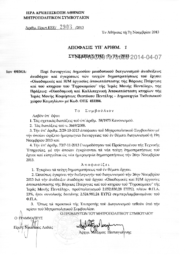 9. Οικοδοιμές και Η/Μ Εργασίες Αποκατάστασης της βόρειας πτέρυγας της Ιεράς Μονής Πεντέλης