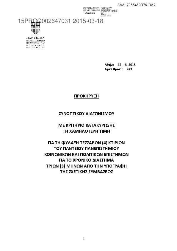 10. Συνοπτικός Διαγωνισμός, με σφραγισμένες προσφορές, με κριτήριο κατακύρωσης την χαμηλότερη τιμή, για την παροχή υπηρεσιών φύλαξης από ιδιωτική εταιρεία, τεσσάρων (4) κτιρίων του Παντείου Πανεπιστημίου Κοινωνικών και Πολιτικών Επιστημών, γ...