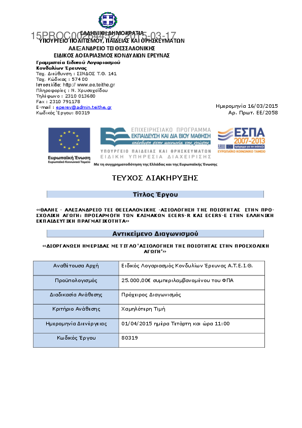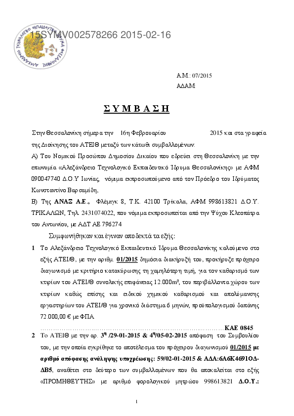 1. ΠΡΟΧΕΙΡΟΣ ΔΙΑΓΩΝΙΣΜΟΣ 01/2015 ΓΙΑ ΤΟΝ ΚΑΘΑΡΙΣΜΟ ΤΩΝ ΚΤΙΡΙΩΝ ΤΟΥ ΑΤΕΙ-Θ ΤΟΥ ΠΕΡΙΒΑΛΛΟΝΤΑ ΧΩΡΟΥ ΤΩΝ ΚΤ