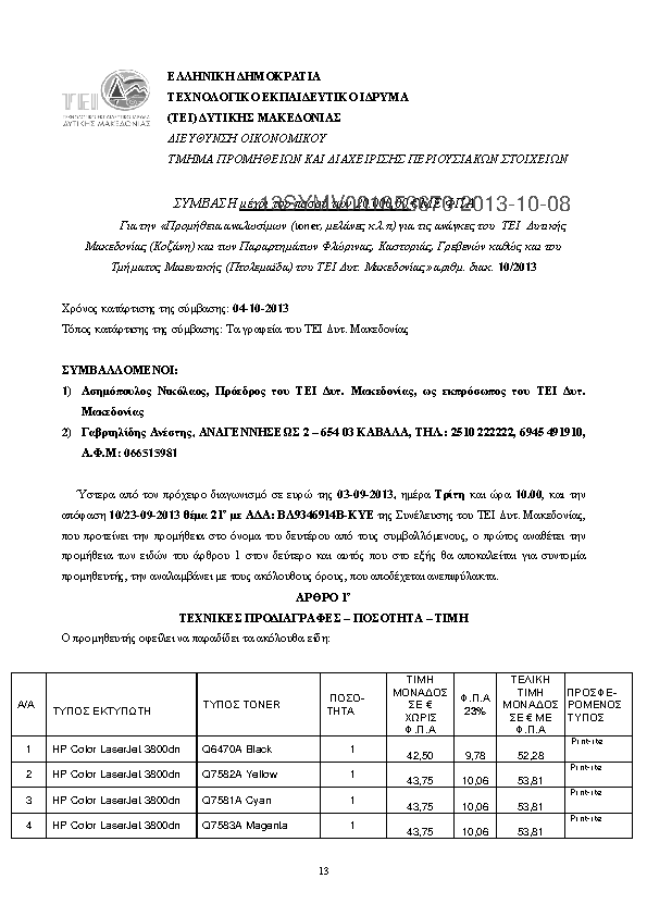 6. Προμήθεια αναλωσίμων (toner, μελάνες κ.λ.π) για τις ανάγκες του ΤΕΙ Δυτικής Μακεδονίας (Κοζάνη) κα