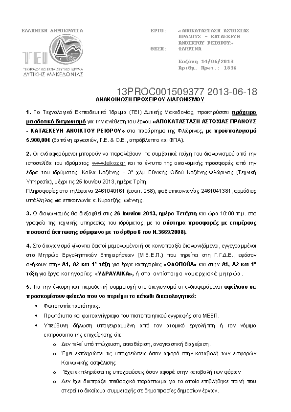 1. ΑΝΑΚΟΙΝΩΣΗ ΠΡΟΧΕΙΡΟΥ ΔΙΑΓΩΝΙΣΜΟΥ ΤΟΥ ΕΡΓΟΥ "ΑΠΟΚΑΤΑΣΤΑΣΗ ΑΣΤΟΧΙΑΣ ΠΡΑΝΟΥΣ