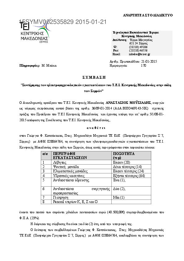 4. Συντήρηση των ηλεκτρομηχανολογικών εγκαταστάσεων του Τ.Ε.Ι. Κεντρικής Μακεδονίας στις Σέρρες