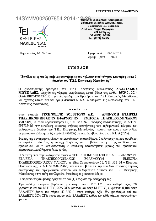 1. Εκτέλεση εργασίας ετήσιας συντήρησης του τηλεφωνικού κέντρου και τηλεφωνικού δικτύου του Τ.Ε.Ι. Κεν
