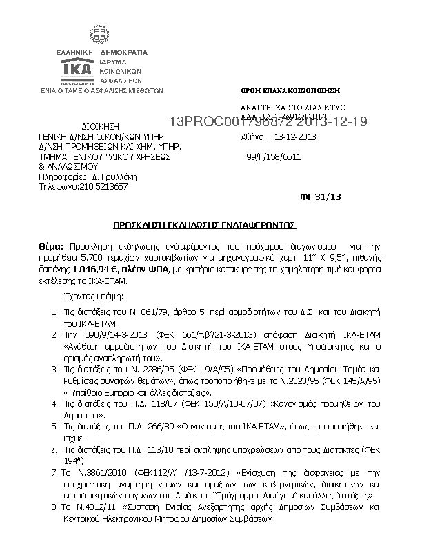 1. Πρόσκληση εκδήλωσης ενδιαφέροντος του πρόχειρου διαγωνισμού για την προμήθεια 5.700 τεμαχίων χαρτοκιβωτίων για μηχανογραφικό χαρτί 11’’ Χ 9,5’’, πιθανής δαπάνης 1.046,94 €, πλέον ΦΠΑ, με κριτήριο κατακύρωσης τη χαμηλότερη τιμή και φορέα ...