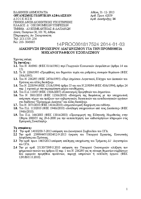 3. ΔΙΑΚΗΡΥΞΗ ΠΡΟΧΕΙΡΟΥ ΔΙΑΓΩΝΙΣΜΟΥ ΓΙΑ ΤΗΝ ΠΡΟΜΗΘΕΙΑ ΜΗΧΑΝΟΓΡΑΦΙΚΟΥ ΕΞΟΠΛΙΣΜΟΥ