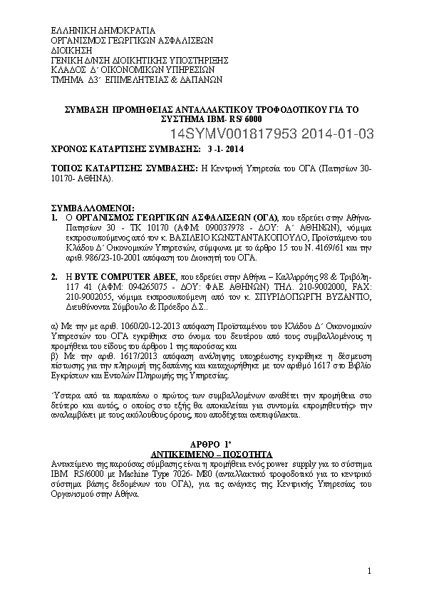 4. ΣΥΜΒΑΣΗ ΠΡΟΜΗΘΕΙΑΣ ΑΝΤΑΛΛΑΚΤΙΚΟΥ ΤΡΟΦΟΔΟΤΙΚΟΥ ΓΙΑ ΤΟ ΚΕΝΤΡΙΚΟ ΣΥΣΤΗΜΑ ΒΑΣΗΣ ΔΕΔΟΜ. ΤΟΥ ΟΓΑ