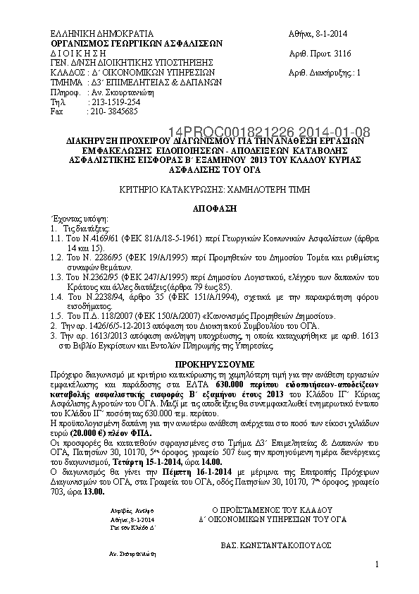 10. ΔΙΑΚΗΡΥΞΗ ΠΡΟΧΕΙΡΟΥ ΔΙΑΓΩΝΙΣΜΟΥ ΕΡΓΑΣΙΩΝ ΕΜΦΑΚΕΛΩΣΗΣ ΕΙΔΟΠΟΙΗΣΕΩΝ ΑΣΦ.ΕΙΣΦΟΡΩΝ Β ΕΞΑΜ. 2013