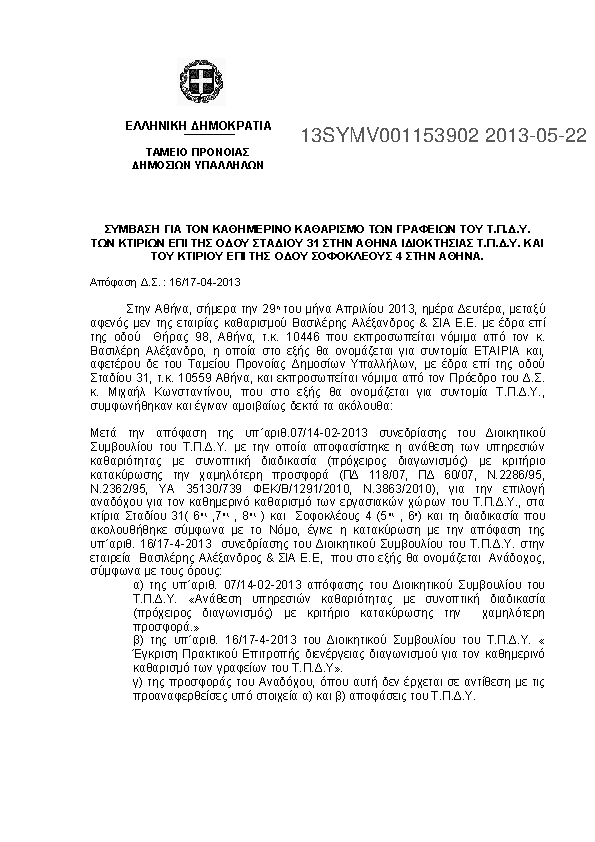 1. ΣΥΜΒΑΣΗ ΓΙΑ ΤΟΝ ΚΑΘΗΜΕΡΙΝΟ ΚΑΘΑΡΙΣΜΟ ΓΡΑΦΕΙΩΝ ΤΟΥ ΤΠΔΥ ΤΩΝ ΚΤΙΡΙΩΝ ΣΟΦΟΚΛΕΟΥΣ 4 & ΣΤΑΔΙΟΥ 31