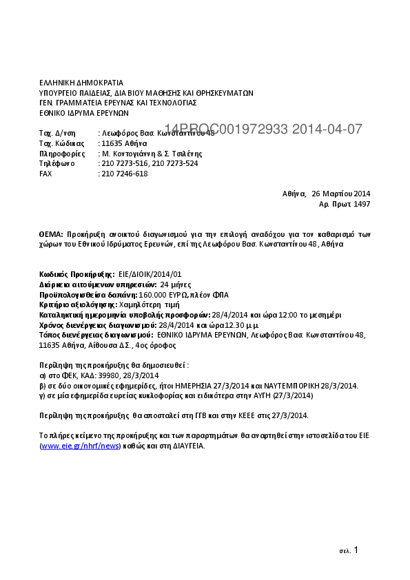 5. Προκήρυξη ανοικτού διαγωνισμού για την επιλογή αναδόχου για τον καθαρισμό των χώρων του Εθνικού Ιδρύματος Ερευνών, επί της Λεωφόρου Βασ. Κωνσταντίνου 48,Αθήνα