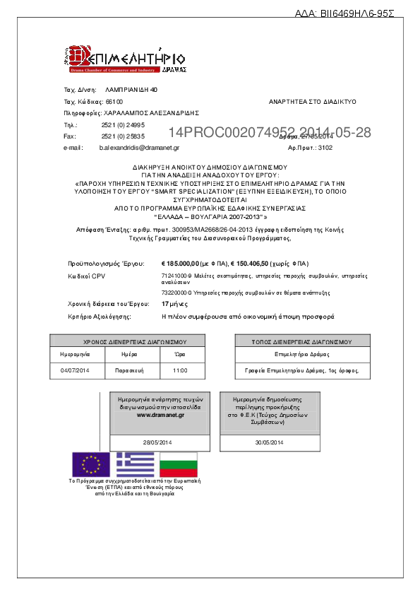 1. ΠΡΟΚΗΡΥΞΗ ΑΝΟΙΚΤΟΥ ΔΙΕΘΝΟΥΣ ΔΙΑΓΩΝΙΣΜΟΥ ΓΙΑ ΤΗΝ ΕΠΙΛΟΓΗ ΑΝΑΔΟΧΟΥ ΓΙΑ ΤΟ ΕΡΓΟ "ΠΑΡΟΧΗ ΥΠΗΡΕΣΙΩΝ ΤΕΧΝΙΚΗΣ ΥΠΟΣΤΗΡΙΞΗΣ ΓΙΑ ΤΗΝ ΥΛΟΠΟΙΗΣΗ ΤΟΥ ΕΡΓΟΥ SMART SPECIALIZATION