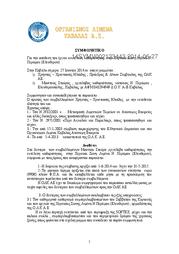 3. ΣΥΜΒΑΣΗ ΑΝΑΘΕΣΗΣ ΕΡΓΟΥ ΕΚΤΕΛΕΣΗΣ ΚΑΘΑΡΙΟΤΗΤΑΣ ΣΤΗ ΧΕΡΣΑΙΑ ΖΩΝΗ ΛΙΜΕΝΟΣ ΕΛΕΥΘΕΡΩΝ