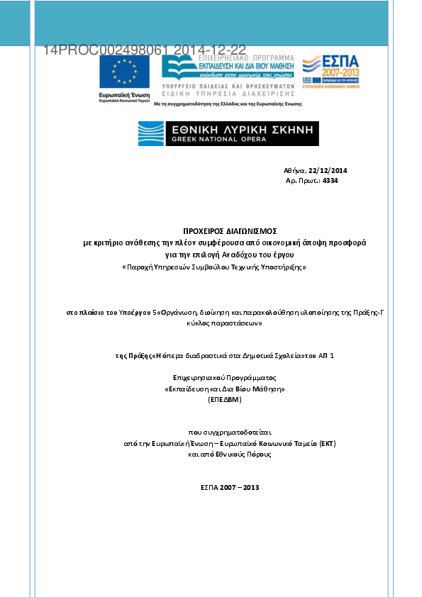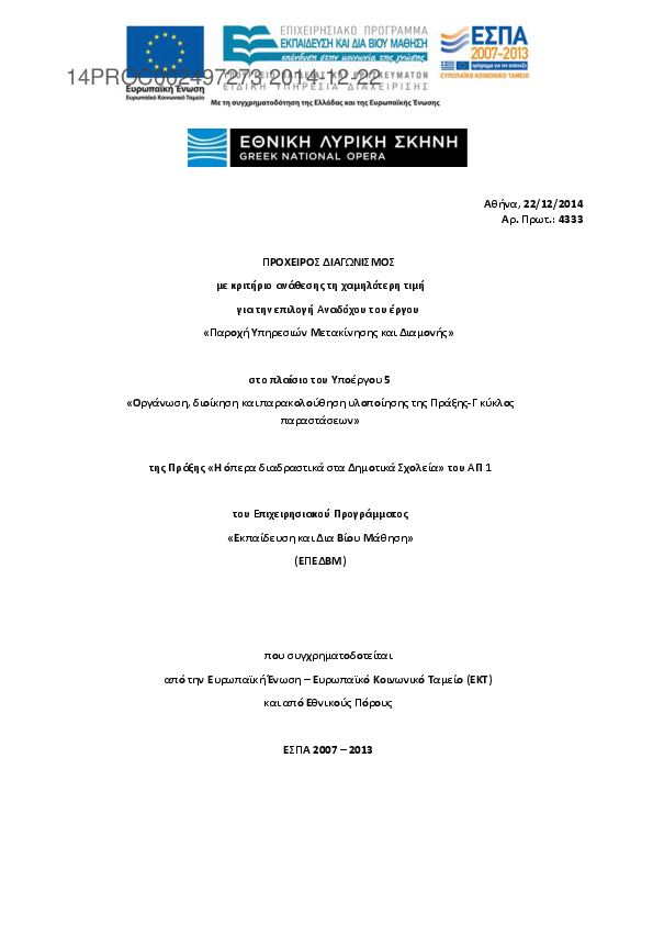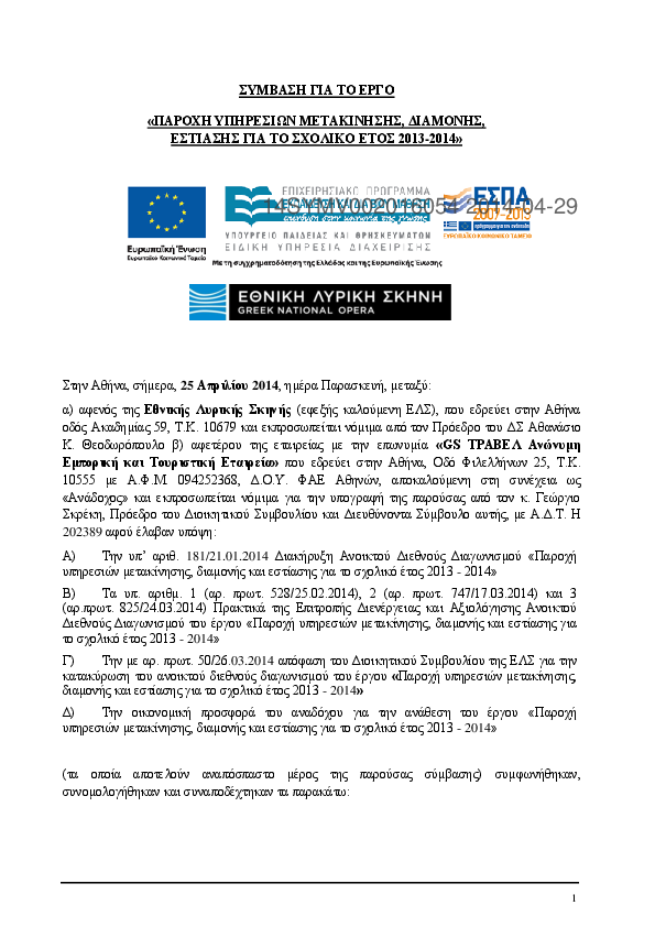 1. Παροχή υπηρεσιών μετακίνησης, διαμονής και εστίασης για το σχολικό έτος 2013 - 2014 Υποέργου 4