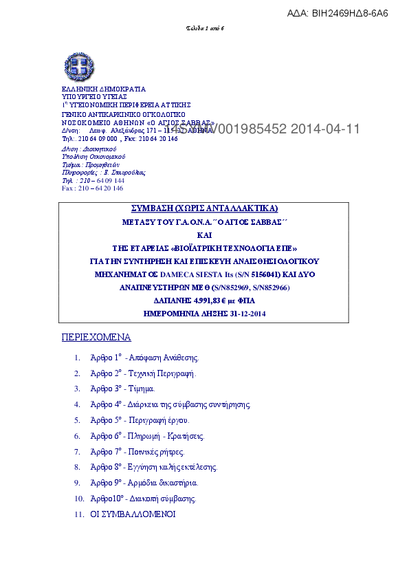 10. Σύμβαση συντήρησης Αναισθησιολογικού μηχ/τος Dameca Siesta iTS και αναπνευστήρων Engstrom της ΜΕΘ