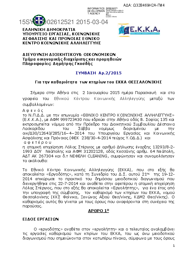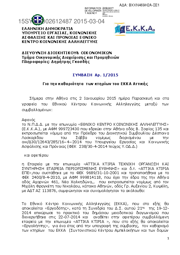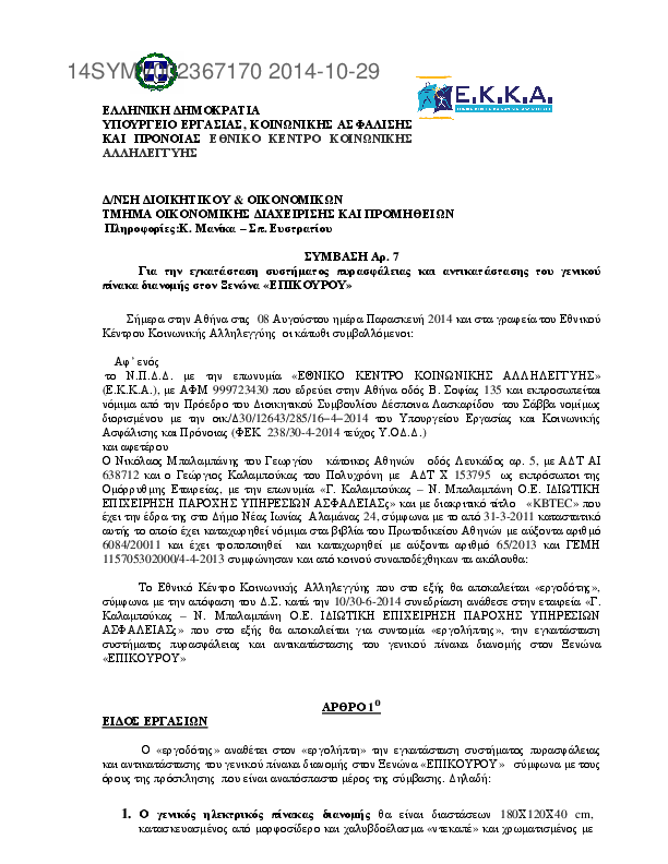 1. Σύμβαση για την εγκατάστ συστήματος πυρασφάλειας &αντικατάστ του γενικού πίνακα διανομής στον Ξενώ