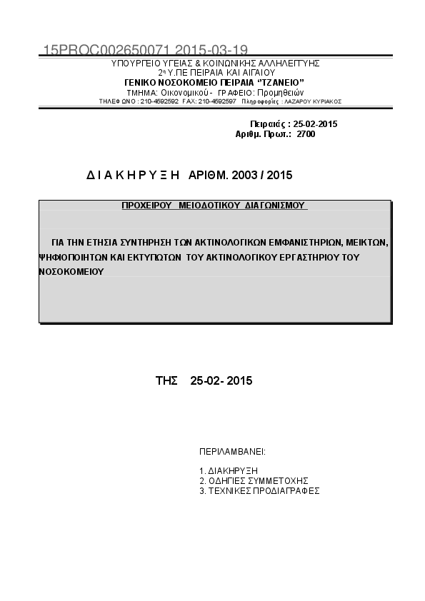 9. ΔΙΑΚΗΡΥΞΗ 2003/2015 ΕΤΗΣΙΑΣ ΣΥΝΤΗΡΗΣΗΣ ΑΚΤΙΝΟΛΟΓΙΚΩΝ ΕΜΦΑΝΙΣΤΗΡΙΩΝ, ΜΕΙΚΤΩΝ, ΨΗΦΙΟΠΟΙΗΤΩΝ ΚΑΙ ΕΚΤΥΠΩ