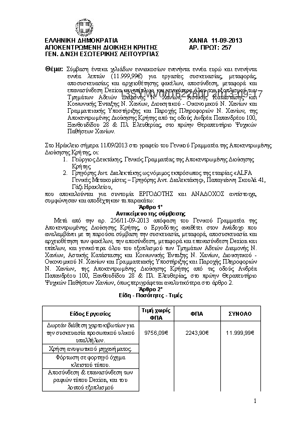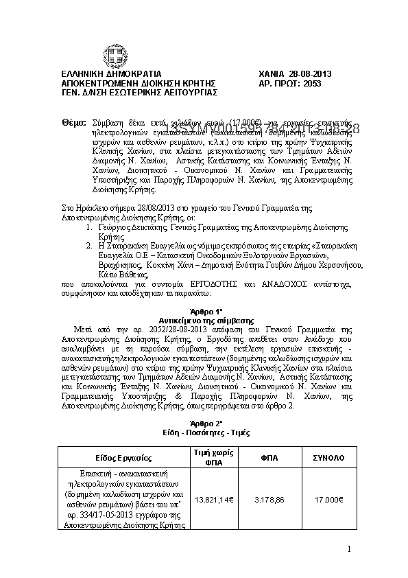 7. Σύμβαση για εργασίες επισκευής Ηλεκτρολογικών Εγκαταστάσεων στο πρώην Θ.Ψ.Π. στα Χανιά