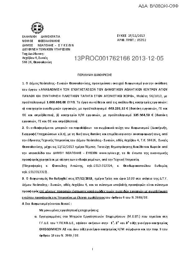 3. Περίληψη Διακήρυξης του έργου «ΑΝΑΒΑΘΜΙΣΗ ΤΩΝ ΕΓΚΑΤΑΣΤΑΣΕΩΝ ΤΟΥ ΔΗΜΟΤΙΚΟΥ ΑΘΛΗΤΙΚΟΥ ΚΕΝΤΡΟΥ ΑΓΙΟΥ ΠΑΥΛΟΥ ΚΑΙ ΣΥΝΤΗΡΗΣΗ ΠΛΑΣΤΙΚΟΥ ΤΑΠΗΤΑ ΣΤΟΝ ΑΓΩΝΙΣΤΙΚΟ ΧΩΡΟ», αρ. μελ. 56/2013