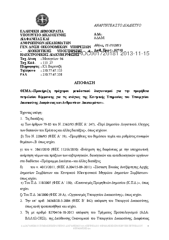 4. Προκήρυξη πρόχειρου μειοδοτικού διαγωνισμού για την προμήθεια πετρελαίου θέρμανσης για τις ανάγκες της Κεντρικής Υπηρεσίας του Υπουργείου Δικαιοσύνης Διαφάνειας και Ανθρωπίνων Δικαιωμάτων