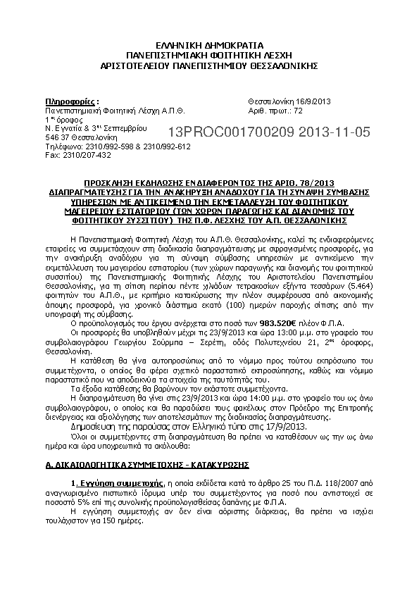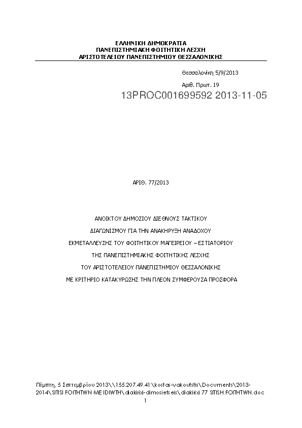1. Διαδικασία διαπραγμάτευσης με σφραγισμένες προσφορές, για την ανακήρυξη αναδόχου για τη σύναψη σύμβασης υπηρεσιών με αντικείμενο την εκμετάλλευση του μαγειρείου εστιατορίου (των χώρων παραγωγής και διανομής του φοιτητικού συσσιτίου) της ...
