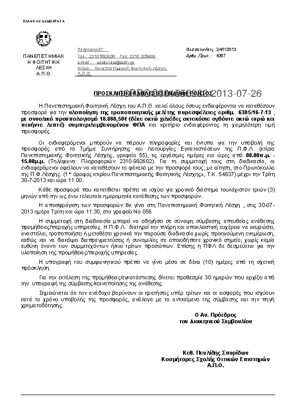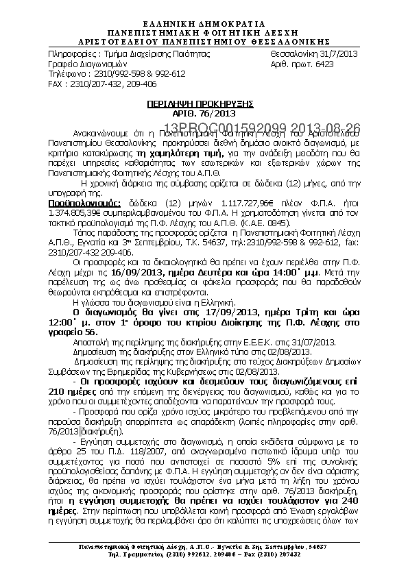 5. Προκηρύσσουμε διεθνή δημόσιο ανοικτό διαγωνισμό, με κριτήριο κατακύρωσης τη χαμηλότερη τιμή, για την ανάδειξη μειοδότη που θα παρέχει υπηρεσίες καθαριότητας των εσωτερικών και εξωτερικών χώρων της Πανεπιστημιακής Φοιτητικής Λέσχης του Α....