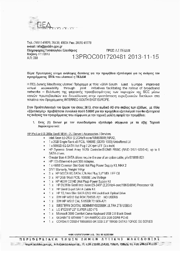 1. «Έγκριση πρωτογενούς αιτήματος ανάληψης δαπάνης, που αφορά την προμήθεια εξοπλισμού: ενός (1) Server και ενός (1) Slatebook με τον συνοδευόμενο εξοπλισμό τους, για τις ανάγκες του προγράμματος SIVA που υλοποιεί η ΠΕΔΔΜ, συνολικού ποσού 5...