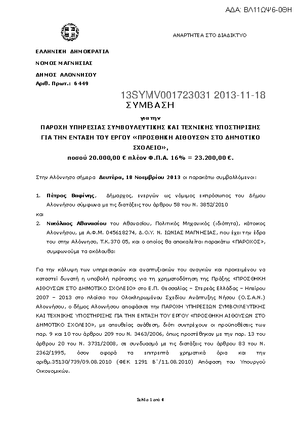 9. Σύμβαση για την Παροχή Υπηρεσιών Συμβουλ. Υποστήριξης "ΠΡΟΣΘ. ΑΙΘΟΥΣΩΝ ΔΗΜΟΤ. ΣΧΟΛΕΙΟΥ"