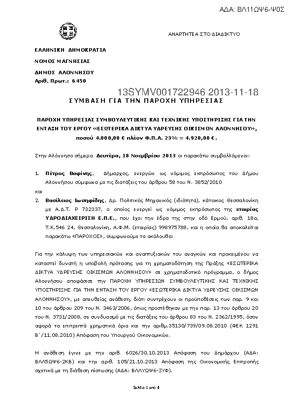 10. Σύμβαση για την Παροχή Υπηρεσιών Συμβουλ. Υποστήριξης "ΕΣΩΤΕΡΙΚΑ ΔΙΚΤΥΑ ΥΔΡΕΥΣΗΣ"