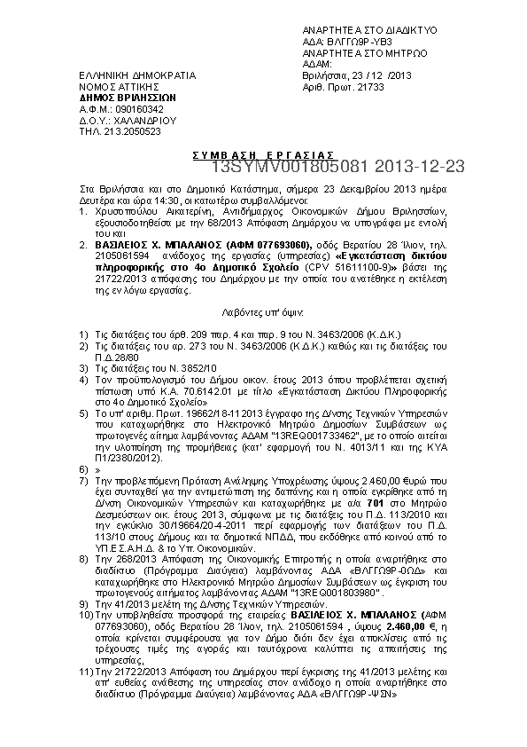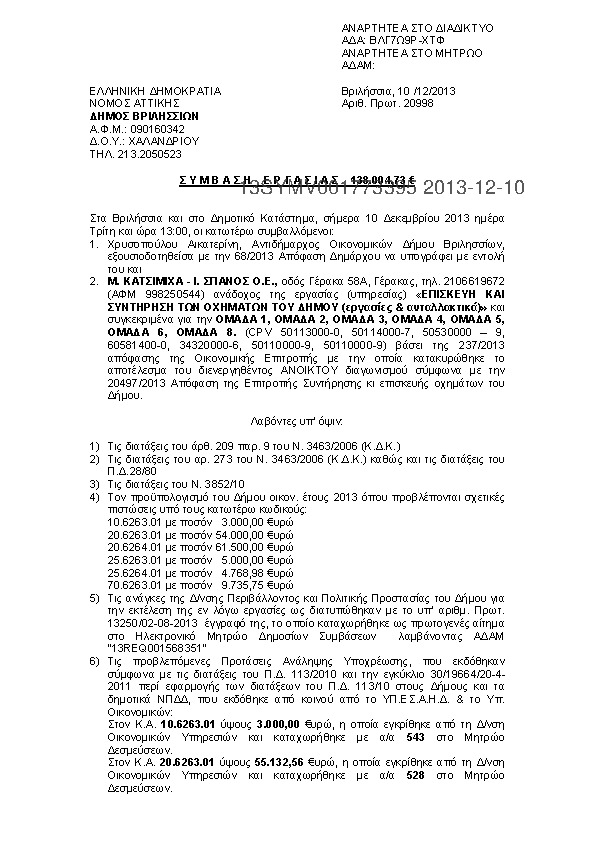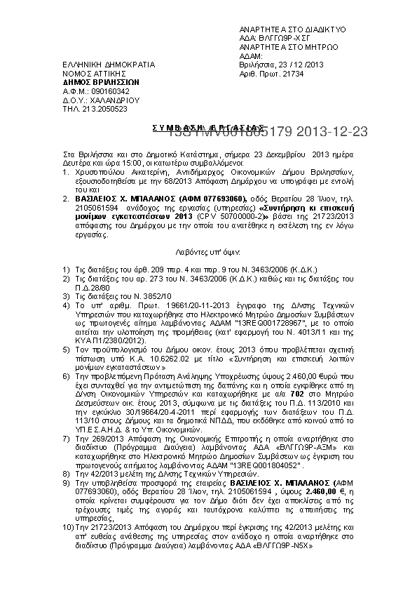 5. Σύμβαση για την εκτέλεση της εργασίας (υπηρεσίας) "Συντήρηση κι επισκευή μονίμων εγκαταστάσεων 2013"