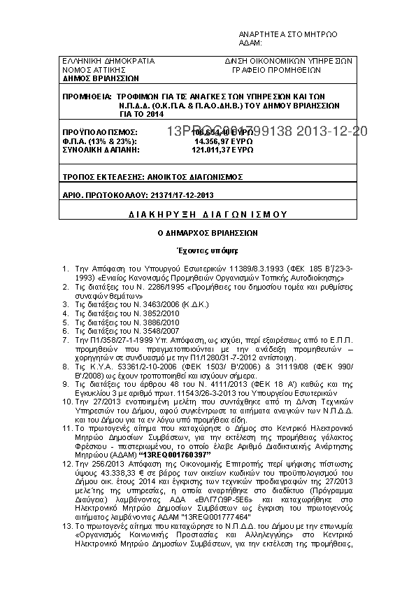 1. διακήρυξη ΑΝΟΙΚΤΟΥ ΔΙΑΓΩΝΙΣΜΟΥ για την εκτέλεση της ΠΡΟΜΗΘΕΙΑΣ ΤΡΟΦΙΜΩΝ ΓΙΑ ΤΙΣ ΑΝΑΓΚΕΣ ΤΩΝ ΥΠΗΡΕΣΙΩΝ ΚΑΙ ΤΩΝ ΝΠΔΔ (Ο.Κ.Π.Α. & Π.Α.Ο.ΔΗ.Β.) ΤΟΥ ΔΗΜΟΥ ΓΙΑ ΤΟ 2014